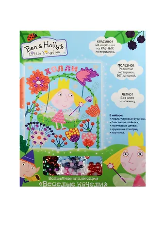 В наборе для аппликации "Холли" ТМ "Бен и Холли": цветная картинка (20х17 см), бусинки, пайетки, набор двусторонних кружочков-стикеров с клеевым слоем, которые легко прик