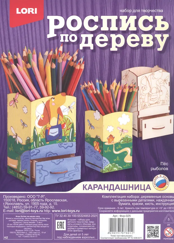 Подставка для канцелярии удобная не большого размера. В набор входит тоненькие фанерки с деталями подставки. Надо выдавить деталь с фанеры, краски акриловые, кисть, не большая инструкция, как собирать. Сын быстро собрал. Разукрасили, сохнет быстро. Нижний ящик выдвижной, как у комода, можно сложить резинку, скрепки, маленькую точилку. Спасибо магазину за большой ассортимент не только книг.
