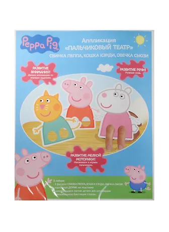 В наборе для аппликации «Пальчиковый театр» ТМ «Свинка Пеппа»: 3 фигуры высотой 12 см с отверстиями для пальчиков (Свинка Пеппа, Котенок Кэнди, Овечка Сьюзи), картонная полянка на подставке, самоклеящиеся цветные детали для аппликации из мягкого материала ЭВА, блестящие стразы с клеевым слоем. Все элементы легко приклеиваются и прочно держатся. Аппликация выполняется с помощью развивающих игровых заданий. Товар сертифицирован и предназначен для детей от 3 лет. Безопасно для детского использования.