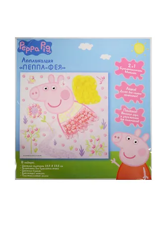 В наборе для аппликации «Пеппа-фея» ТМ «Свинка Пеппа»: цветная картонная картинка (23х23 см), фигурка Пеппы с клеевой основой, набор цветной бумаги для бумагопластики, блестящие детали мозаики из мягкого, приятного на ощупь материала ЭВА, пластмассовые вращающиеся глазки, двухсторонний скотч. Товар сертифицирован.