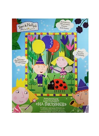 3D-аппликация "На полянке" с героями мультфильма "Маленькое королевство Бена и Холли" - это творческая работа и эффективное упражнение для пальчиков. В начале работы выберите детали нижнего слоя. Затем, не вырезая, снимите с них защитную пленку и вклейте в контур рисунка. Остальные фрагменты наклейте слоями по образцу. Прикрепите к героям вращающиеся глазки. Красивая и объемная аппликация готова! Во время этой интересной работы малыш развивает тактильно-визуальное восприятие, моторику, восприятие цвета и формы, образно-логическое мышление. В наборе для 3D-аппликации: цветная картинка 29,5х24 см, самоклеящиеся детали из мягкого материала ЭВА, пластмассовые вращающиеся глазки с клеевым слоем. Все детали легко приклеиваются и прочно держатся. Товар сертифицирован. Срок годности: 5 лет.