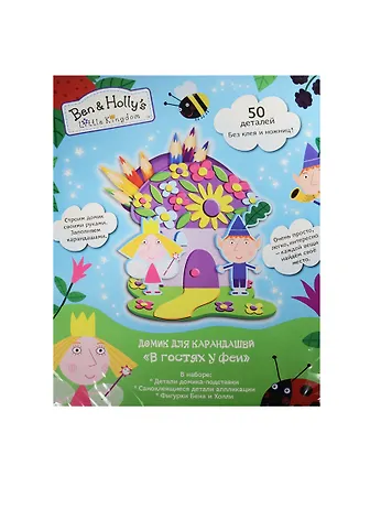 В наборе для создания домика для карандашей "В гостях у феи" ТМ "Маленькое королевство Бена и Холли" 50 деталей: детали домика-подставки, 2 фигурки героев, самоклеящиеся детали из мягкого материала ЭВА. Товар сертифицирован. Срок годности: 5 лет.