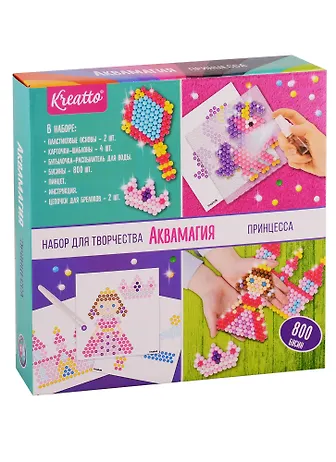 С набором "Аквамагия" ваш ребенок создаст из цветных бусинок фигурки в виде принцессы, королевского замка, зеркала, пони, короны и хрустальной туфельки. А с помощью цепочки можно сделать настоящий брелок! Расположите картинку-шаблон под прозрачную основу так, чтобы нарисованные на шаблоне бусины совпали с углублениями на основе. Чтобы сделать брелок, поместите нижнее звено цепочки между двумя бусинами и зафиксируйте, распылив на него немного воды из пульверизатора. Так цепочка приклеится к основе. Соберите фигурку по шаблону, намочите все бусины водой и оставьте на 1-2 часа до полного высыхания. За это время бусинки склеятся между собой, образовав цельную фигурку. Необыкновенный брелок готов! В наборе "Аквамагия. Принцесса" ТМ Kreatto 811 деталей: 800 бусин (диаметр бусин - 5 мм; каждый цвет в отдельном пакетике), 4 шаблона с цветными рисунками, 2 пластиковые основы, бутылочка-распылитель для воды, пинцет, 2 цепочки для брелоков, инструкция. Материалы: пластик, картон, металл. Товар сертифицирован. Упаковка: коробка (18 х 18 х 4 см).