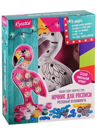 В наборе "Ночник для росписи. Розовый фламинго" ТМ "Креатто": устойчивая картонная фигура фламинго (27,5х15,2х5 см), гирлянда из 11 LED-ламп, 11 колб для гирлянды, 8 цветов красок, гель-блеск, пайетки, кисточка. Гирлянда работает от 2 батареек ААА (в комплект не входят). Необходимо раскрасить картонную фигурную основу, украсить её гелем с блёстками и пайетками, вставить в её отверстия колбочки, поместив в них с обратной стороны лампочки гирлянды. Материалы: пластик, картон, краски. Товар сертифицирован. Упаковка: коробка с окном (25х29,5х5,8 см).