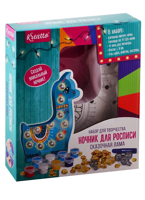 В наборе "Ночник для росписи. Сказочная лама" ТМ "Креатто": устойчивая картонная фигура ламы (18,2х26,7х5 см), гирлянда из 11 LED-ламп, 11 колб для гирлянды, 8 цветов красок, гель-блеск, пайетки, кисточка. Гирлянда работает от 2 батареек ААА (в комплект не входят). Необходимо раскрасить картонную фигурную основу, украсить её гелем с блёстками и пайетками, вставить в её отверстия колбочки, поместив в них с обратной стороны лампочки гирлянды. Материалы: пластик, картон, краски. Товар сертифицирован. Упаковка: коробка с окном (25х29,5х5,8 см).