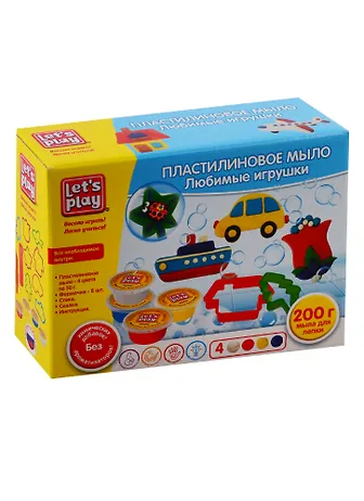 В наборе "Любимые игрушки" ТМ Let's Play: 4 цвета пластилинового мыла по 50 г, 8 фигурных формочек, стека, скалка, цветная инструкция в картинках. Пластилиновое мыло имеет безопасный состав, не содержит химических добавок и ароматизаторов, хорошо мылится. Готовая фигурка застывает в течение 12-24 часов. Изготовлено из пластилиновой мыльной основы, пластмассы, бумаги. Товар сертифицирован. Упаковка: коробка (19х14х6 см).