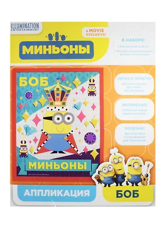 В наборе для объемной аппликации «Миньоны» ТМ «Minions Universal Studios»: цветная картинка на картоне размером 29,5х24 см, детали из мягкого материала ЭВА, которые не нужно вырезать. Все элементы обладают клеевым слоем, легко приклеиваются и прочно держатся. Товар сертифицирован. Упаковка – пакет с цветным вкладышем-инструкцией.
