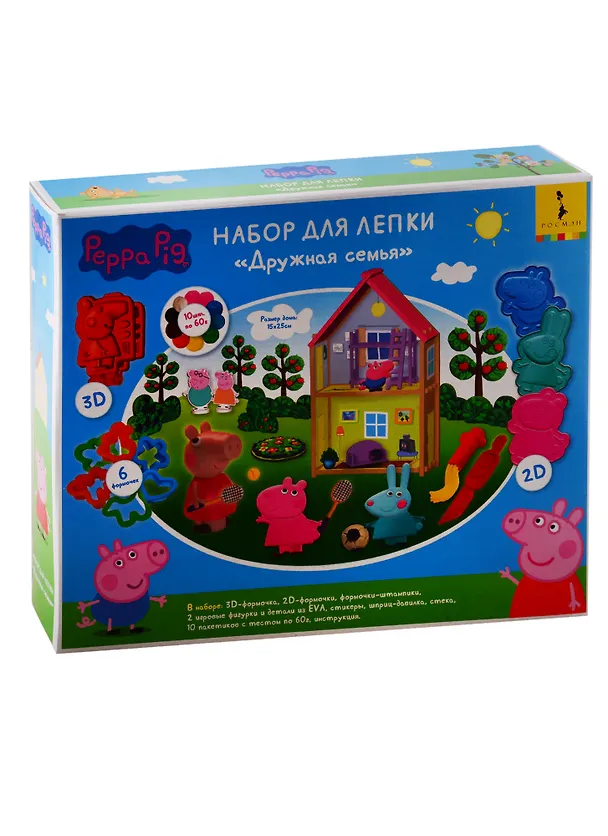 В наборе "Дружная семья" ТМ "Свинка Пеппа" 20 предметов: 3D-формочка Пеппы, три 2D-формочки (Джордж, Сьюзи и Ребекка),10 пакетиков цветного теста по 60 г, стека, шприц-давилка, 2 игровые фигурки (мама и папа) и детали домика из ЭВА, стикеры, цветная инструкция (А4). Тесто пластичное, не липнет к рукам и рабочей поверхности, не имеет запаха, застывает на воздухе в течение 12-24 часов. Внимание: не пригодно для еды! Товар сертифицирован. Упаковка: коробка (33х27,5х6,5 см).
