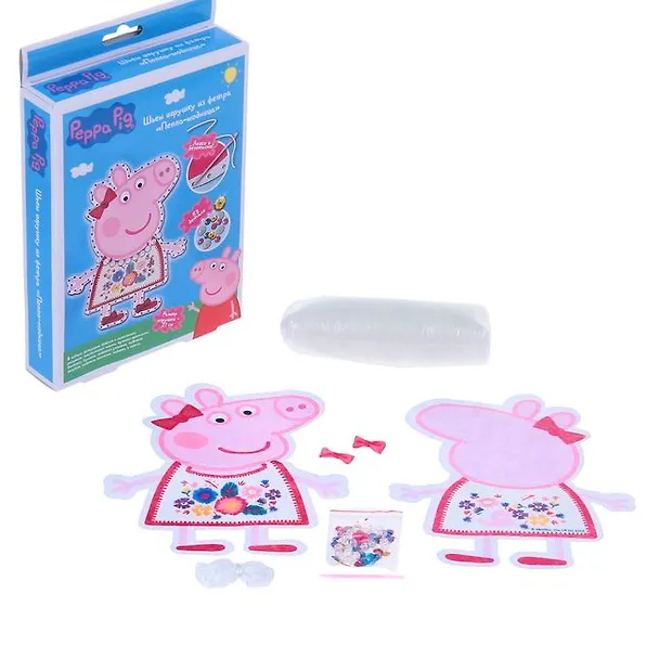 С этим набором ваша малышка сошьет очаровательную игрушку своими руками - легко и безопасно! Украсьте фетровые детали блестящими пайетками, а затем сложите их белой стороной внутрь, совмещая контур фигурки. Вденьте нитку в иголку и начните обшивать контур туловища, набивая сначала ручки и ножки. Постепенно наполняйте всю игрушку и, закончив, закрепите нить узелком. Украсьте голову Пеппы цветочком, башмачки - бантиками, сделайте бусы для свинки. А инструкция в картинках вам поможет в этом. Создание игрушки своими руками учит ребенка шить, развивает мелкую моторику и координацию движений.