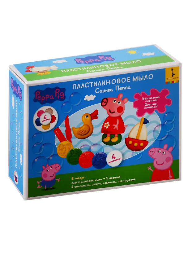 В наборе "Свинка Пеппа": 5 цветов пластилинового мыла (4 цвета по 30 г, 1 цвет - 15 г), 4 двусторонних штампика с героями и предметами мультфильма, стека, скалка, цветная инструкция в картинках. Пластилиновое мыло имеет безопасный состав, не содержит химических добавок и ароматизаторов, хорошо мылится. Готовая фигурка застывает в течение 12-24 часов. Изготовлено из пластилиновой мыльной основы, пластмассы, бумаги. Товар сертифицирован. Упаковка: коробка (19х14х6 см).