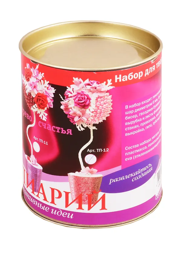Топиарий или дерево счастья, которое можно «вырастить» своими руками. Большое количество расцветок, разнообразие соцветий и бутонов поможет создать свой волшебный сад дома. Все необходимое имеется в наборе, включая пошаговую подробную инструкцию с фото. В процессе сборки у ребенка развивается мелкая моторика, практические навыки, необходимые в течение всей жизни: умение пользоваться ножницами, клеем, утюгом, объемное мышление, чувство композиции. Поделка на долгие годы может стать необычным украшением интерьера, прекрасным подарком практически к любому празднику, а также талисманом для вашего дома. Визуализируйте свои желания. Вплетайте положительные эмоции, сокровенные желания в свой шедевр в процессе работы. А если вы положите записку с заветным желанием в кашпо с гипсом, оно обязательно исполнится! Комплектация: 1. Шар пенопластовый 6 см. 2. Лист FOM EVA и готовая вырубка. 3. Клей. 4. Зубочистки. 5. Проволока. 6. Гвоздики-булавки. 7. Бусины, бисер. 8. Стакан. 9. Гипс. 10. Ложка. 11. Выкройка. 12. Инструкция с пошаговым описанием и фото.