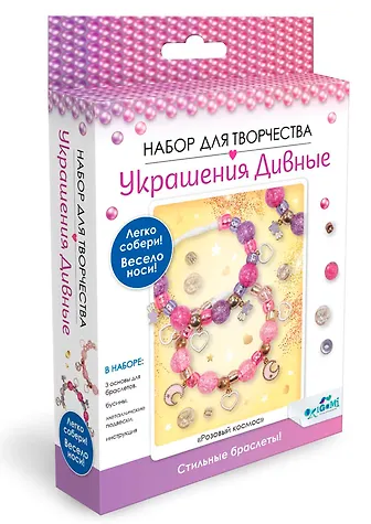 Прикольный набор для творчества. Не так уж и много разных бусин, но если брать его в подарок для не сильно взрослого ребёнка, то за свою цену норм. Браслетики получаются однотипными, что есть, то есть, ну, с таким набором это и не удивительно, с другой стороны, и стоит он недорого. Замочки не особенно прочные, хотя и ожидать чего-то суперского от набора за 650 р. было бы очень странно)