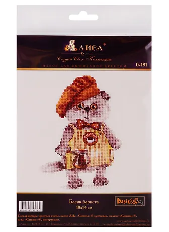 В набор входит канва молочного цвета, две иглы (для вышивания и для шва-строчки, отличающиеся размером ушка), нитки мулине восемнадцати цветов, инструкция и схема вышивки. Палитра ниток разбита по номерам цветов, соответствующих схеме, что очень удобно при вышивании. Цвета подобраны неяркие, но готовая работа смотрится максимально естественно и объемно! Кот Басик на ней словно живой, а из его турки будто доносится кофейный аромат! Кроме того, изумительно проработаны мелкие детали вышивки, такие как глаза кота, усы, галстук-бабочка, турка и эмблема на фартуке.