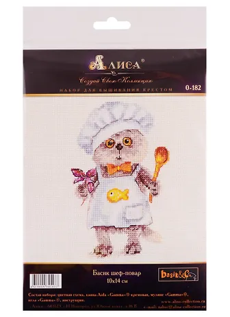 Безумно милый Басик из "котовой" серии от "Алисы". Может показаться, что все Басики на одну мордочку. Но я вышиваю уже четвертого и не могу не удивиться индивидуальности каждого котика. Это выражено не только в обозначении профессии (фартук, колпак), но и в неуловимом выражении обаятельной моськи повара! Состав набора на высоте, приятные наощупь нитки ровно ложатся, позволяя создать на канве рельеф плюшевой кошачьей шёрстки.