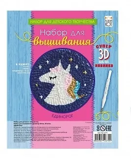 Вышивание 3D иглой, или ковровое вышивание, – разновидность декоративной вышивки, при которой нить пряжи, шелка либо другого материала продергивается через ткань, формируя на ней рисунок. При продергивании нити получаются мелкие петли. В набор "Единорог" входит: ткань, пряжа, пробивная игла, инструкция.Возраст 6+