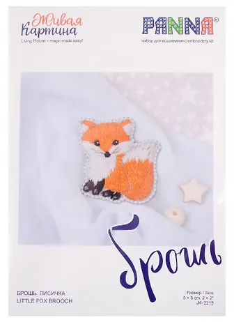 В набор входит: фетр с напечатанным рисунком, фетр для задней стороны броши, хлопчатобумажные нитки мулине Gamma на держателе, игла Gamma, основа для броши из картона, замочек для броши, подробная пошаговая инструкция с цветными иллюстрациями. Брошь, сделанная своими руками, – эффектный аксессуар как для повседневного образа, так и для праздничного мероприятия. Брошь может стать отличным подарком родным, близким, друзьям и коллегам. Техника исполнения: гладь.