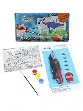 Познакомьте Вашего ребенка с техникой выжигания по коже! Набор для выжигания по коже "ВОЕННЫЙ САМОЛЕТ" содержит все необходимое для новичка,чтобы создать свой шедевр. Несмотря на доступность и простоту, занятие этим древнейшим искусством поможет раскрыть творческий потенциал, а также развить воображение и художественные навыки. Рекомендован детям от 6 лет под присмотром взрослых. В комплекте: электровыжигатель, краски, кисточка, кожа 15х20 и 21х30 см.Возраст8+.