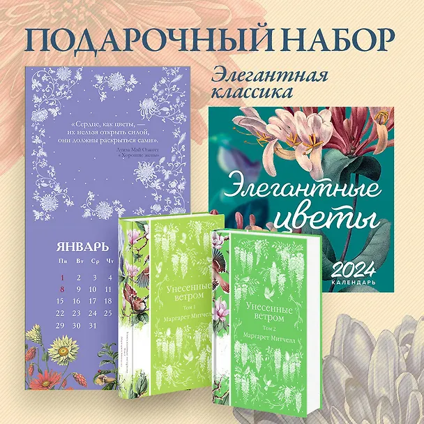Набор "Элегантная классика" (Книга "Унесенные ветром (комплект из 2-х книг", настенный календарь "Элегантные цветы")