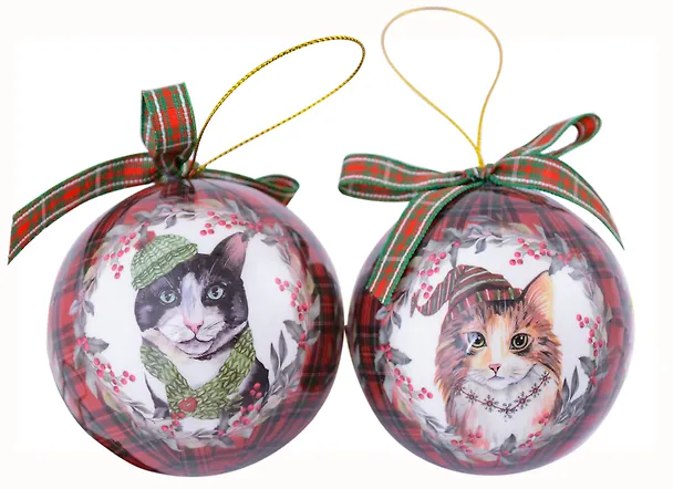 Котики - просто прелесть! Такие милашки, в симпатичных шапках, с красивым обрамлением, как в фоторамке! У меня собралась уже целая компания елочных игрушек с котиками, новые вписались в их число и заняли достойное место. Шары среднего размера, из пластика, наклейка яркая и сделана качественно, у подвеса есть бантик.