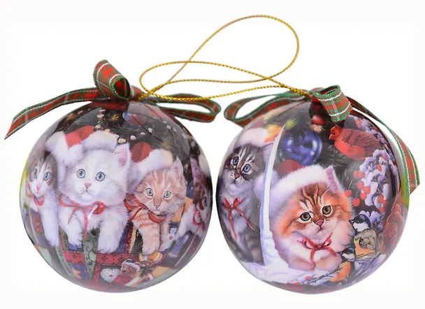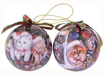 Довольно крупные шарики с яркими и красивыми картинками с новогодними или рождественскими котятами ) Замечательно смотрятся на ёлочке. Частые падения с ёлки выдержали (кот всегда старается) и не испортились - пластик значит качественный, отколов нет) Плёнка от огней тоже не облезла и не подплавилась. Шнурки с бантами на них тоже крепко держатся. Рекомендую к покупке - будут радовать глаза)
