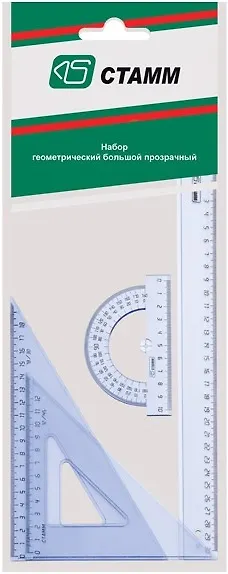 Набор геометрические большой.  Подойдёт для рисования,  а также для использования на уроках математики.  Качество набора хорошее,  цвет прозрачный,  голубого оттенка. В состав набора входят линейка,  транспортир и два угольника разных размеров. Размер удобный,  оптимальный для использования. Упакован хорошо