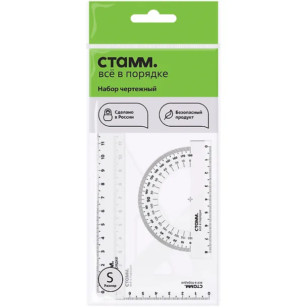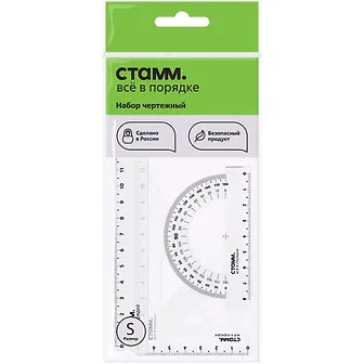Набор бюджетный и это в принципе сразу видно,пластик тоненький и хрупкий,если случайно надавить,или прижать чем-то тяжелым,то линейка сломается,это точно.Начинается шкала на линейке не с самого края(кому-то это может быть принципиально),так же разметка хоть и нанесена яркой черной краской,но все равно она быстро стирается от частого держания в руках.Зато есть самые необходимые приборы,и треугольник,и транспортир-это безусловно плюс.