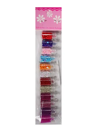 Совершенно неожиданно в разделе "Товары для творчества" увидела этот набор. Стеклянные мини бутылочки с мельчайшими цветными шариками. Шарики можно фиксировать с помощью клея на любой поверхности: бумага, дерево, кожа. Они придают творческим работам очень красивый и необычный вид. В наборе 12 цветов. Поэтому можно создать переход цвета от темного к светлому.