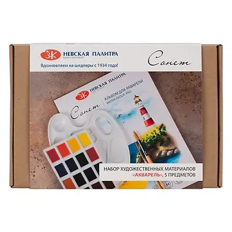 Набор художественных материалов "Сонет" "Акварель", 302х214х25 мм. Состав набора: - Набор акварельных красок "Сонет", 16 цветов - Альбом склейка для акварели "Сонет", 100% целлюлоза, 200 г/м2, среднее зерно, А4, 12 листов - Палитра пластиковая овальная, 10 ячеек - Кисть из синтетики круглая "Сонет", короткая ручка №3 - Кисть из синтетики круглая "Сонет", короткая ручка №5