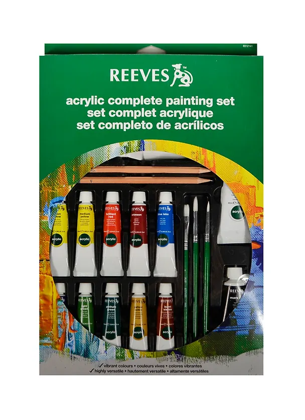 Набор художественный (акрил.краски 10*10мл, 2х22мл, 3 кисти, 2 ч/гр кар-ша., палитра, 3 холста, точилка, мастихин, 2 ластика,) подвес, (р), REEVES