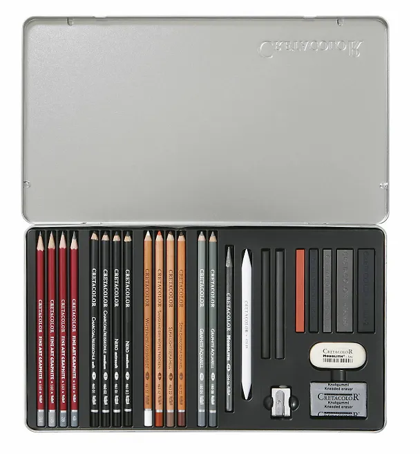 Профессиональный художественный набор "TEACHER'S CHOICE ADVANCED" в металлической коробке . В состав набора входит: профессиональные чернографитовые карандаши 4шт., твердость -2Н,НВ, 2В,4В; карандаши "Неро", водостойкий карандаш на масляной основе, дает блестящий черный штрих, корпус круглой формы диаметром 7,5 мм, диаметр стержня 3,8 мм, 2 шт.; угольный карандаш, круглый корпус диаметром 7,5 мм, диаметр стержня 3,8 мм, 2 шт. ; карандаши темная и светлая сепия, карандаш сангина, карандаш белый мел; профессиональный водорастворимый (акварельный) чернографитовый карандаш, шестигранный корпус диаметром 7,5 мм, диаметр стержны 3,8 мм , 2 шт. - твердость 4В и 8В; графитовый карандаш "Monolith"