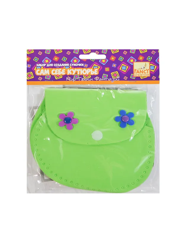 Набор для создания сумочки. Материал: пористая резина. В наборе: детали корпуса сумочки, безопасная игла из пластика с округлым наконечником, нить для сшивания деталей, шнур для создания ручки сумочки, инструкция с шаблонами.