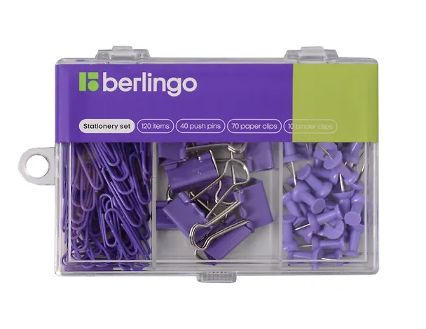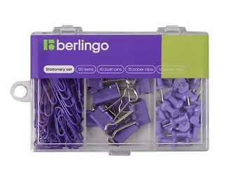Очень красивый фиалковый цвет, приятный, не вырви глаз. Что я считаю важно. Удобно брать с собой или перевозить куда нибудь, тк находится в пластиковом контейнере и не поранит, не порвет что нибудь. Сам товар качественный, удобно, что все лежит в одном месте, краска не слазит, сами скрепки служат уже долго. Советую брать еще на подарок, неплохо, канцелярия всегда необходима.