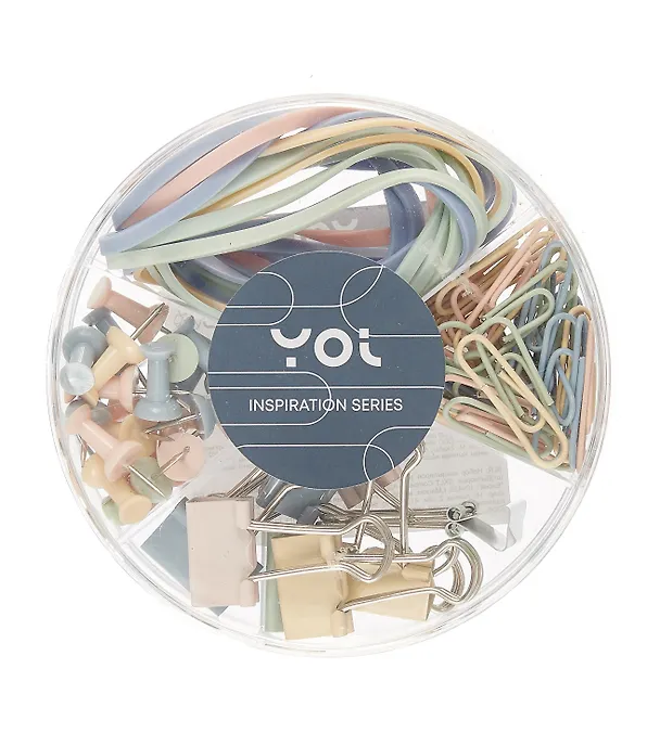 Всего понемногу - 15 резинок, около 10 зажимов, 30+ скрепок и примерно столько же кнопок) Приятный дизайн, коробочка плотно закрывается после многоразового использования. Но все же она негабаритная, поэтому пришлось пересыпать все, кроме кнопок, прямо в пенал.