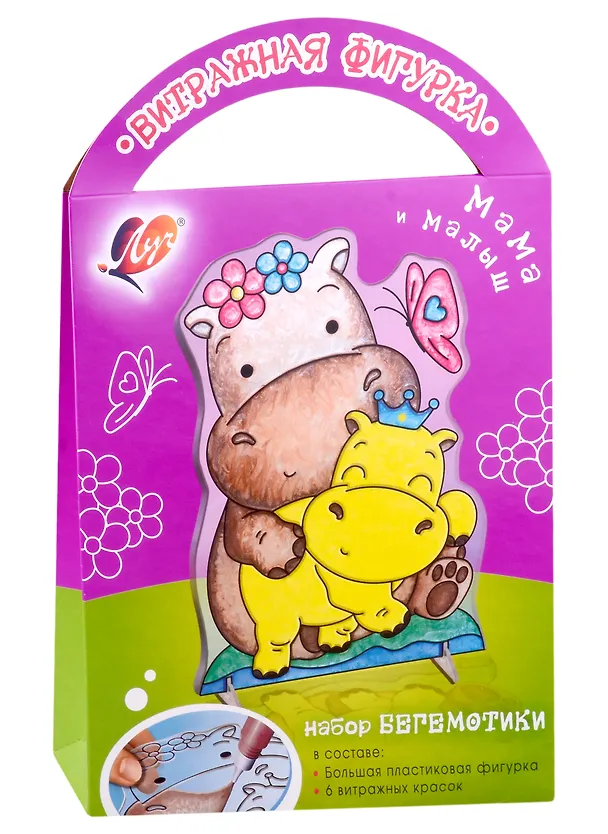 В наборе: 1 пластиковая фигурка с подставкой, 6 туб (по 5 мл) с витражной краской, инструкция.