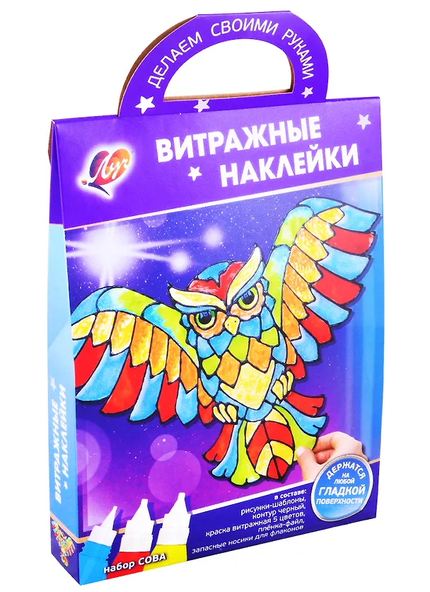 Набор предназначен для изготовления витражных оригинальных аппликаций на окно. Прозрачные краски на основе водной акриловой дисперсии предназначены для создания на стекле эффекта витража. Состав набора: витражная краска в тубах по 15 мл 5 цветов, чёрный контур, рисунок - шаблон, файл А4, запасные носики для флаконов.