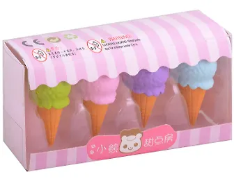 сами ластики разбираются на рожок и шарик мороженого. цвета яркие, выглядят как конфетки))
