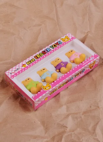Эти миленькие яркие ластики были куплены для школьницы. Были использованы не по прямому назначению — приспособили как игрушки для кукол в домик. Что важно, это цельный ластик, кофточки у мишек не снимаются, а значит, не пропадут. Пробовали использовать, стирают хорошо и поднимают настроение! Честно, жаль такими фигурками стирать!