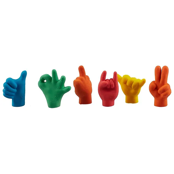 Набор ластиков в виде рук, сложенных в популярные жесты, порадует человека с хорошим чувством юмора. Каждый ластик можно надеть на карандаш, это удобно и забавно.