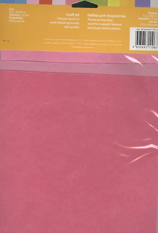 Супер классный набор фетровых листов . В упаковке 4 штуки листок разных цветов. Данный фетр формата а4, хватит его надолго. Делаю из этих цветов ротики и ушки для игрушек. Достаточно плотный фетр, сильно не рвётся при отрезание ножницами. Этих листов вам хватит надолго, качество и цена отличная. Для людей творческих данный набор незаменим. Всем рекомендую к покупке такой набор.