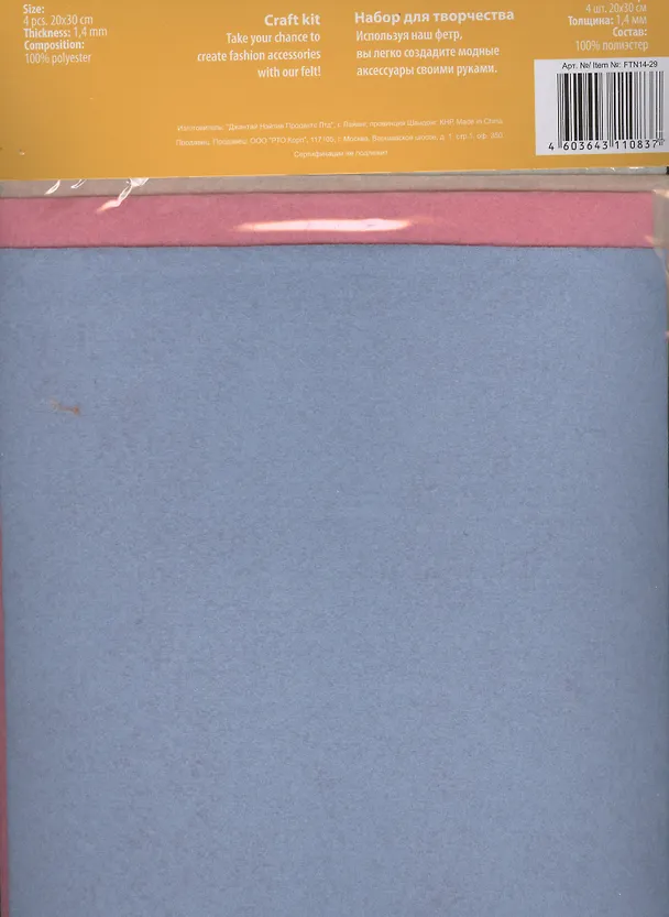 Набор листового фетра (FTN14-29) (4шт) (20х30см) (1,4мм) (упаковка)