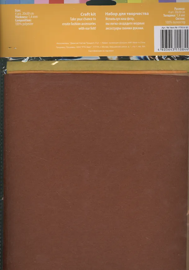 Набор листового фетра (FTN14-30) (4шт) (20х30см) (1,4мм) (упаковка)