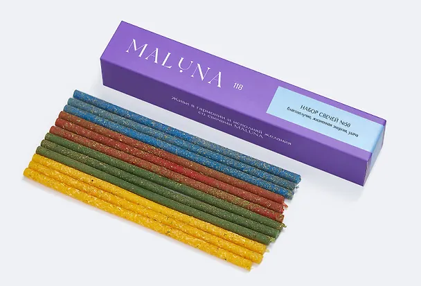 Набор свечей #50 MALUNA укрепит материальное благополучие, привлечет жизненную энергию и удачу в начинаниях. В набор входят синие свечи с лавандой 3 шт, зеленые свечи с базиликом 3 шт, красные свечи с мятой 3 шт, желтые свечи с календулой 3 шт. Идеально подходят для медитаций и практик, направленных на переход на следующий жизненный этап, а также при раскладах таро и загадывании желаний. Каждая свеча изготавливается вручную в период растущей луны, чтобы привлечь в вашу жизнь желаемое. Свечи не содержат отдушек и ароматизаторов, поэтому обладают натуральным ароматом.