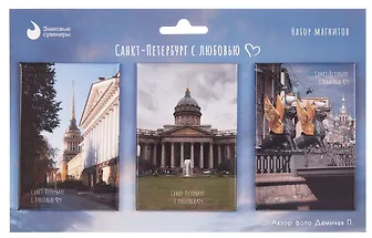 Набор магнитов с фотографиями Павла Демичева, на которых запечатлены знаковые достопримечательности Санкт-Петербурга: здание Главного адмиралтейства, величественный Казанский собор и мифические грифоны, чкоторые сторожат проход по Банковскому мосту.