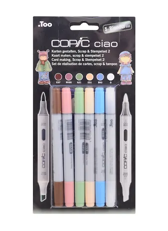 Набор состоит из 5 маркеров COPIC Ciao и бесцветного бледера COPIC Ciao для смешивания цветов и сглаживания переходов. Набор упакован в блистер.