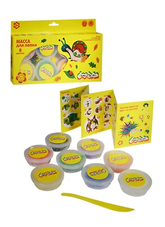 Набор для лепки содержит: масса для лепки (8 цветов по 14 г), специальный стек для лепки - 1 штука, внутри упаковки - 8 мастер-классов. Слепи игрушку своими руками!