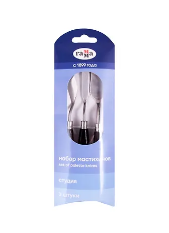 Очень хороший набор мастихинов, буквально на все случаи жизни. Все три штуки имеют разные формы. У одного, того что самый большой, металлическая часть самая широкая, другой поуже удлинённый и третий ромбовидной формы и имеет как бы своеобразные ушки.