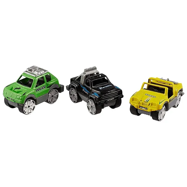 В набор машинок входят три автомобиля, имеющие металлический корпус и свободный ход колес. Машинки окрашены сочными красками, прочны и долговечны. С помощью таких игрушек можно пополнить имеющийся автопарк или начать создавать новый.