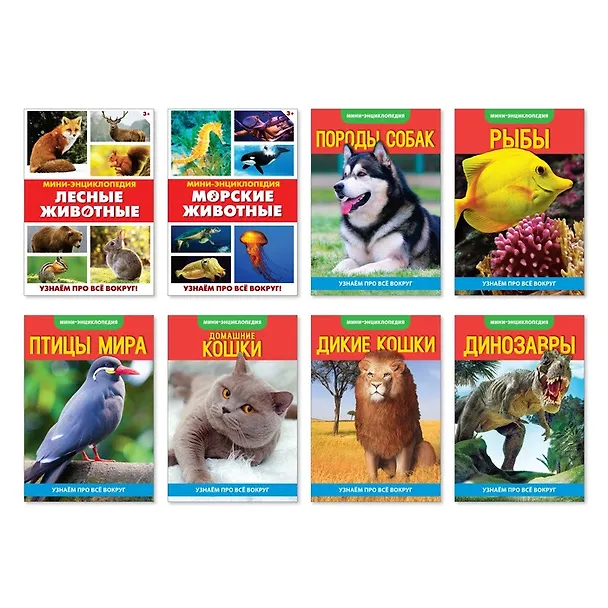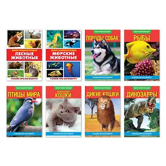 8 мини-энциклопедий для детей, обложки хоть и в мягком переплете, но сделаны качественно, яркие картинки животных: птиц, рыб, лесных обитателей, диких кошек, домашних кошек, собак, динозавров.