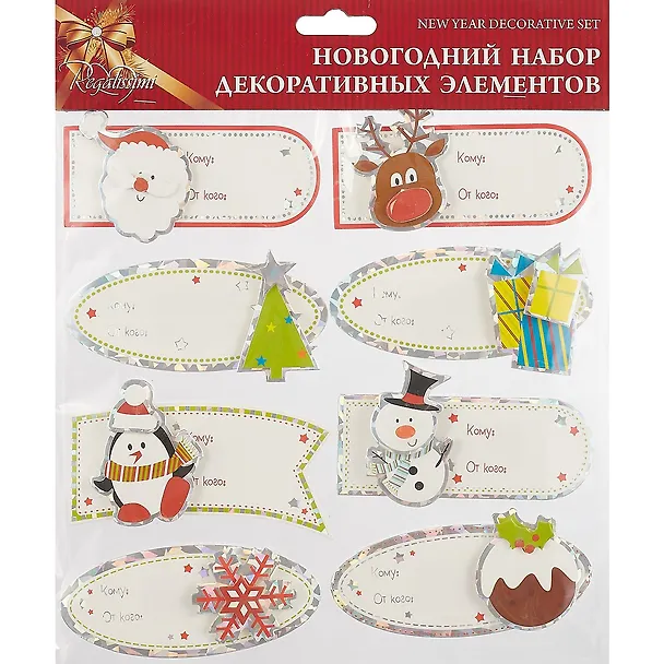 Новогодний набор декоративных 3D тэгов (самоклеящихся ярлычков для подписи подарков), для украшения подарочной упаковки, 8 шт в наборе; (ручная работа); эффект: голография; в пакете с европодвесом; Размер 24 х 29,7 см NY16-3DTAG-HLG1