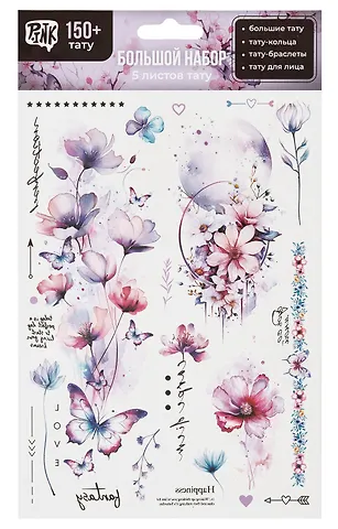 Набор наклеек-татуировок, представленный в виде пяти листов, является превосходным дополнением к вашему декору. Татуировки придают окружающим предметам и поверхностям особый шарм и оригинальность.